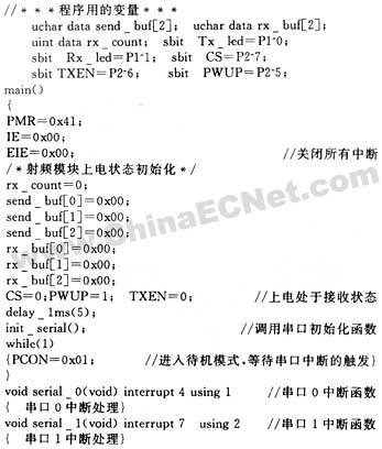 单片机上电后,首先对系统和串口进行初始化,然后单片机进入待机模式,直到两个串口中的一个发生中断硬转为工作模式,处理中断程序。主要的程序代码如下: