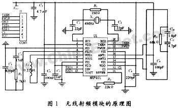 在本设计中,无线射频模块采用挪威nordic公司推出的nrf401无线收发芯片。该芯片使用433mhz ism频段,是真正的单片uhf无线收发一体芯片,他在一个20脚的芯片中包括了高频发射、高频接收、pll合成、fsk调制、fsk解调、多频道切换等,是目前集成度最高的无线数传产品[1]。无线射频模块采用在板差分环形天线,天线端口的负载阻抗为380ω,其电路原理见图1,图中列出了各外围元件的参数,其中j1口为无线射频模块与控制模块的接口。