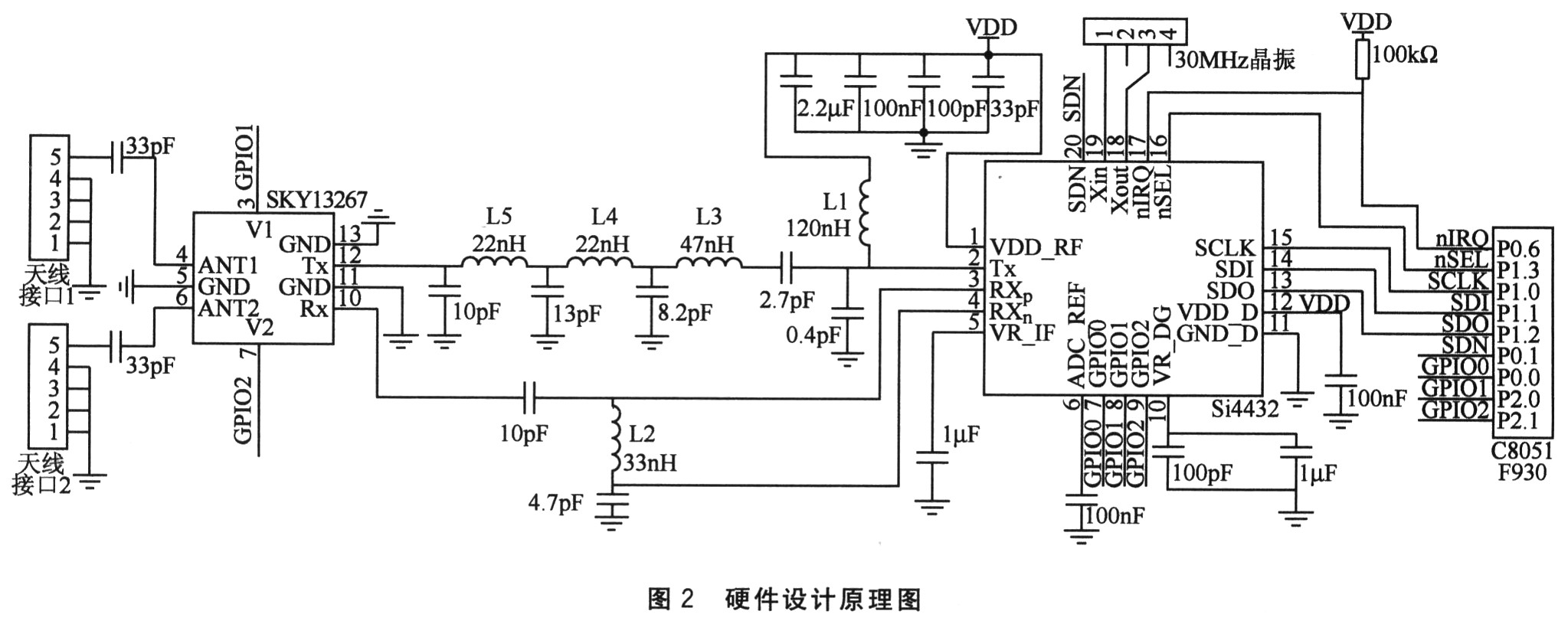MOSI用于从C8051F930到Si4432的串行数据传输;MI-SO用于从Si4432到C8051F930的串行数据传输;SCK用于同步C8051F930和Si4432之间在MOSI和MISO线上的串行数据传输;nSEL作为片选信号,只有片选信号为低电平时,对Si4432的操作才有效。硬件设计原理图如图2所示。