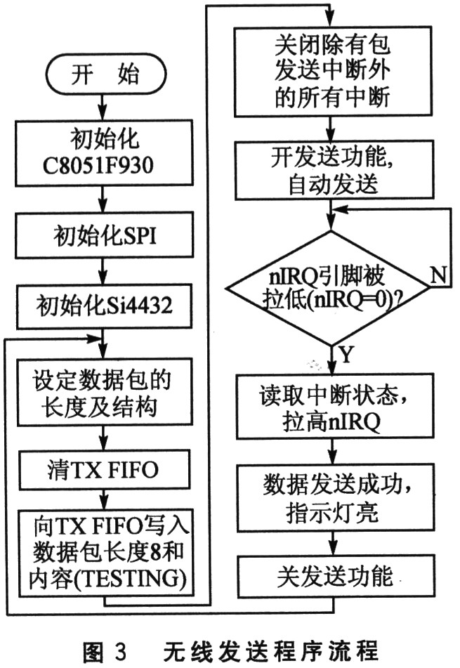 软件编程采用模块化设计思想,系统中各主要功能模块均编成独立的函数由主程序调用。功能模块包括:初始化程序(包括初始化C8051F930、SPI、Si4432),无线发送程序,无线接收程序等。无线发送程序负责写入数据载荷,并根据通信协议为数据载荷加上前导码、同步字、数据载荷长度及CRC校验字节,形成数据包将其发送出去;无线接收程序负责接收并检验数据包中的CRC字节,以确保接收到的数据的正确性。