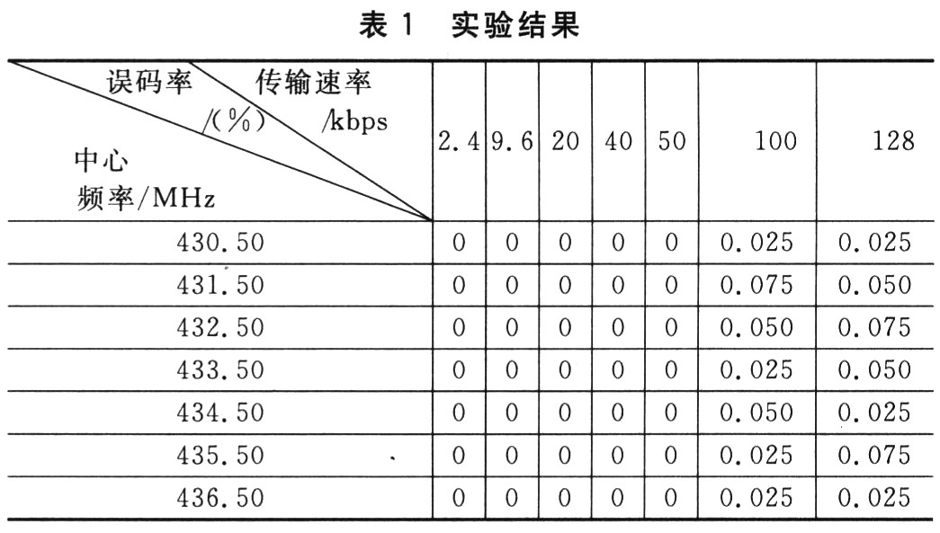 为验证本无线射频收发系统设计的可靠性,进行了7组“发射模块一接收模块”通信实验。在空旷地通信距离约为1 500 m时7组“发射模块一接收模块”分别工作在430.50 MHz、431.50 MHz、432.50 MHz等7个中心频率上,带宽均取112.8 kHz,频率偏移取士25 kHz,发送4 000个数据包,实验结果如表1所列。
