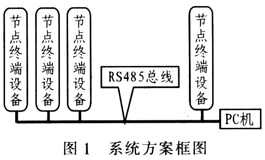 该系统借鉴计算机网络中经典的C/S架构,利用RS485总线连接整个网络。其中计算机作为网络服务器,节点终端设备作为客户机。计算机向各节点终端设备发送命令控制整个网络,接收采集到的数据并做进一步处理;节点终端设备主要负责采集标签数据,响应计算机的命令。系统选用的RS485器件MAX1483使网络节点数最大可达到256个。系统方案框图如图1所示。