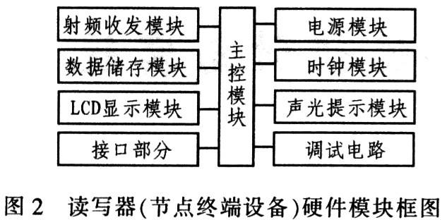 系统设计的重点在于节点终端设备的设计,即超高频RFID读写器的设计。读写器的主要功能是发出询问信号,选择能量场内的应答器,建立数据通信链路并对应答器进行读写操作。超高频RFID读写器的数据采集距离较远,可达到1~30 m,通过软件设置射频收发模块增益大小来控制读写距离,灵活地满足实际要求。读写器硬件按照不同的功能可划分为主控模块、射频收发模块、电源模块、数据存储模块、接口部分、时钟模块、LCD显示模块、声光提示模块及调试电路等,具体如图2所示。