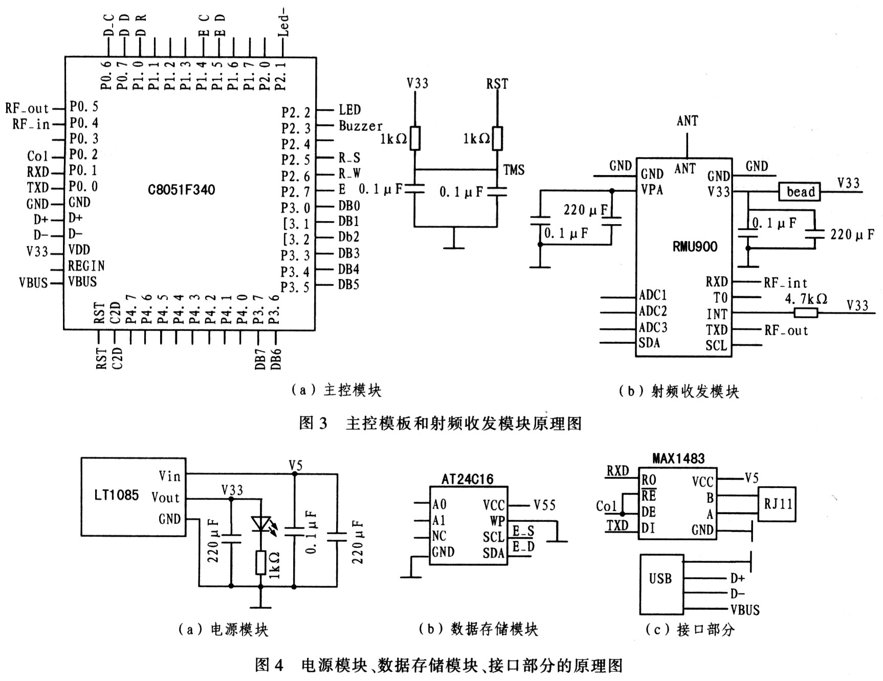 (2)射频收发模块选用RMU900超高频读写模块。该模块通过天线解调、解码射频标签发射的信号,把数据发送给主控器件实现数据的采集,或将命令和数据编码、调制后经天线发送给标签,实现对标签的写操作。数据的传输通过与C8051F340的串口O相连的TX0和RX0实现。图3为主控模板和射频收发模块原理图。