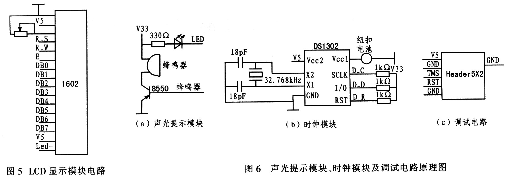 (6)其他模块1602单色液晶显示屏,可显示采集到的数据和操作时间或实时时间。显示数据的传输采用并行传输的方式,加快了屏幕的刷新频率。声光提示模块提示操作完成情况。主要通过主控器件的I/O端口控制LED闪烁和蜂鸣器的鸣笛。时钟模块显示数据采集的时间或实时时间。除板载电源外还设计有备用的纽扣电池,使掉电时时钟不丢失。调试电路实现在线编程,向主控器件C8051F340烧写程序,监测变量值的变化情况,调试程序,辅助完成软件的编写。图5、图6为上述模块的原理电路图。