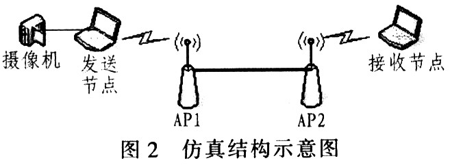 图2是进行实例分析的视频传输系统结构示意图,视频摄像产生视频文件,通过发送节点传输到接收节点,中间通过无线接入点AP1和AP2;发送节点还带有一个CBR流发生器,经中间节点AP1和AP2向接收节点发送,作为影响视频传输的背景流。设置CBR流使用UDP协议,速率为512 Kb/s。AP1和AP2之间的带宽为0.5 Kb/s。AP和移动节点之间的链路为1 Mb/s的IEEE802.11b。使用100帧的图像测试序列foreman_cif.yuv,利用MPEG4编解码器编写仿真脚本文件,在NS中运行仿真,产生一个trace文件。