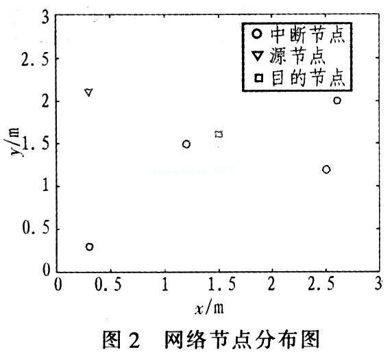 在准静态瑞利平坦衰落信道中仿真.取R=1 bps/Hz,σ2=1。对功率分配效果进行数值计算。为使结果具有一般性,网络节点在3×3的xOy直角坐标系内随机产生如图2,源节点有4个中继节点。根据仿真假设任意源节点到中继节点,中继节点到目的节点间的信道衰落系数分别服从均值为