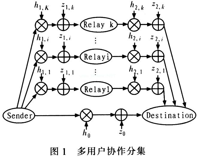 图1为多用户协作分集通信模型。其中,h1.i是Sender(记作S)到Relay(记作R)i的信道,z1,i是噪声。同理,h2,i是Re-lay i到Destination的信道,z2,i是相应的噪声。作如下假设:共有K个中继一发送端一中继,接收端均是单天线。所有终端都是半双工的,即不能同时发送和接收信号。