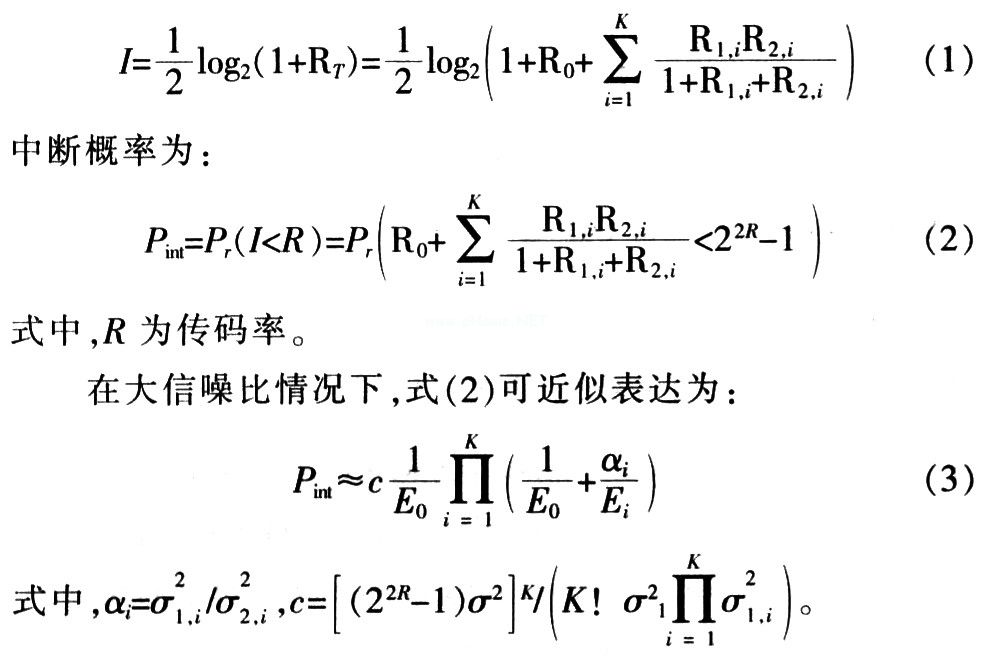 所有K个中继节点均参与协作通信,接收端节点采用最大比和并方式处理接收信号,针对放大转发策略,其瞬时互信息量为: