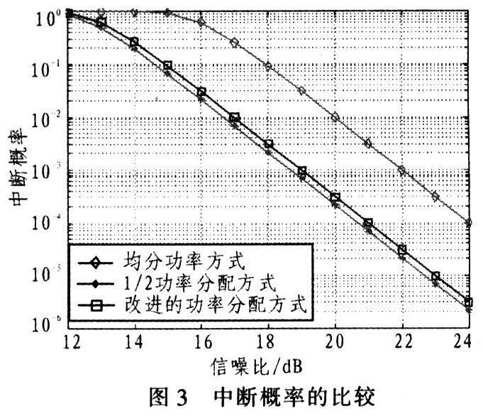 图3中的中断概率是按式(3)计算的数值结果。作为比较.这里还给出了2种传统算法的中断概率性能曲线。传统算法1将功率在源与所有中继节点间平均分配,而传统算法2则是源占一半功率.所有中继平均分配一半功率。从图3中可看出,在中断概率为10-3dB处,该算法比传统算法1和算法2分别带来3 dB、0.5 dB左右的增益。