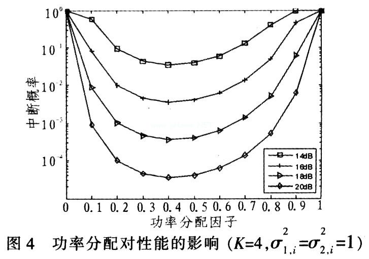 图4、图5对不同功率分配因子时的系统中断概率进行仿真。图4为系统中存在4个中继节点且源与中继、中继与接收端之间的距离都相等时的仿真结果。此时取信道平均增益,σ1,i2=σ2,i2=1。图5是针对图2的节点分布情况进行的仿真。从图4可以看到.功率分配因子在大约0.41处是最佳的功率分配方案,而由式(7)可以得到δ≈0.41。从图5可看到,功率分配因子在大约0.7处是最佳的功率分配方案,而由式(7)可得δ≈0.704。
