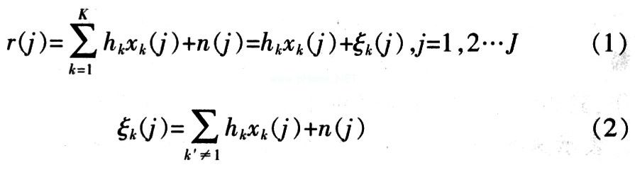 式中,n(j)为高斯白噪声采样,hk为第k个用户的信道衰落系数,ζk(k)为第后个用户第j个码片的失真,根据中心极限定理,ζk(j)满足近似高斯分布,可用均值和方差函数表示。