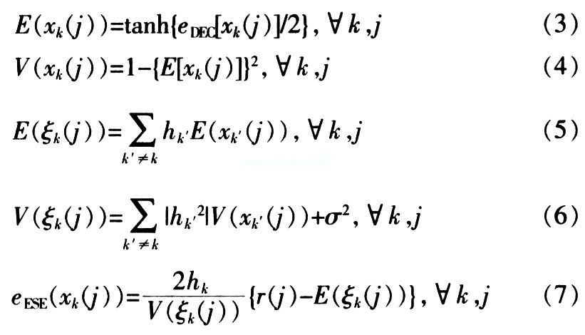 译码器DEC反馈的先验信息经交织后得到eDEC[xk(j)],更新ESE中接收信号的均值和方差,并产生输入到译码器DEC的外信息eESE(xk(j)),外信息经过解交织,作为译码器DEC输入端的先验信息,如此循环迭代直到规定的次数以后,K个用户的译码器分别产生相应信息序列的硬判决值dk。