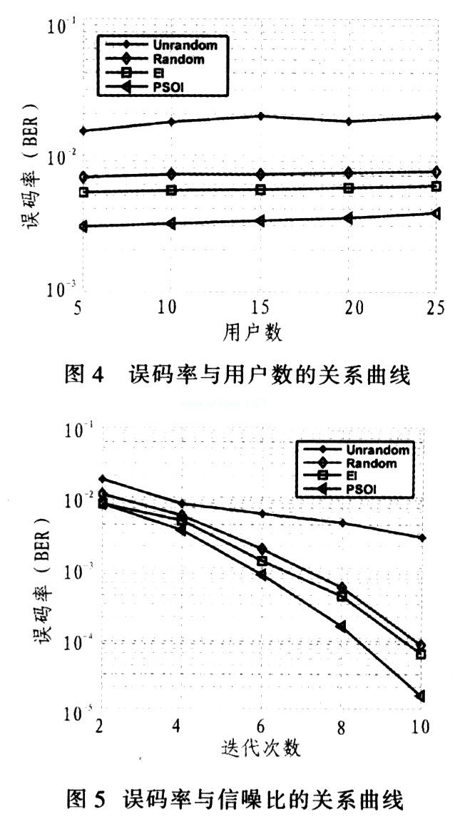 为检验基于粒子群交织算法(PSOI)的性能,将该算法与非随机交织迭代检测(Un-random)、随机交织迭代检测(Ran-dom)和进化交织迭代算法(EI)相比较。仿真条件为:未编码的高斯信道,信道衰落系数hk=k,k∈(1,2,…,K),数据码元长度I=10;扩频码元长度S=4;则交织码元长度J=I×S=40;N=10×K;所有用户使用相同的扩频码元,循环迭代译码10次,蒙特卡罗仿真10 000次,粒子群参数设置为:ω=1 ,c1=c2=2。图2为K=5时Un-random、Random、EI和PSOI的误码率和信噪比关系曲线。由图可知,由于Un-random有较高的互相关性,其性能最差。当信噪比大于8 dB时,PSOI的误码率已接近于零,远优于其他几种算法。图3为K=25时Un-random、Random、EI和PSOI的误码率与信噪比关系曲线。由图可知,当数据码片长度较小时,Random的交织序列的互相关系数较大,使其性能下降;EI由于搜索能力较差,易陷入局部最优解,使得交织性能下降,而PSOI性能较优。图4为SNR=6 dB时Un-random、Random、EI和PSOI的误码率与用户数的关系。由图可知,PSOI随用户数增加的误码率要低于其他几种算法。但由于信噪比较低,EI的误码率较接近PSOI。图5为SNR=9 dB,K=25时Un-random、Random、EI和PSOI的误码率与迭代次数的关系。由图可知。随着迭代次数增加,4种方法误码率都会下降,但PSOI的性能明显优于其他几种算法。