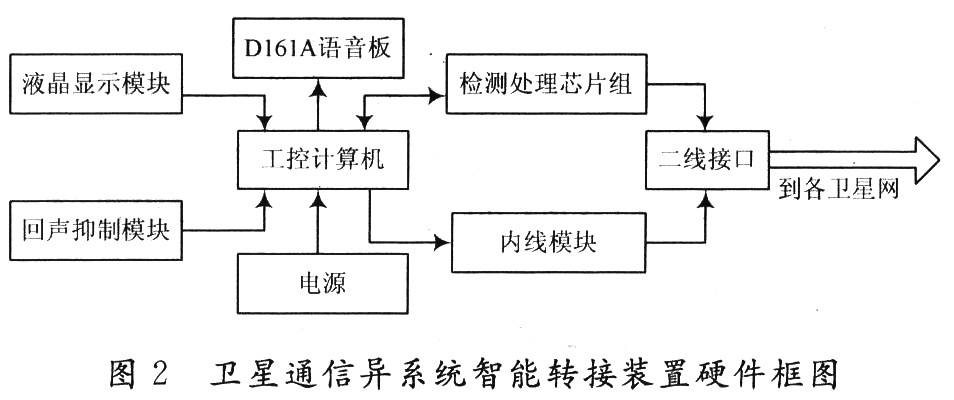 该装置作为连接不同卫星设备接人卫星网络、地面程控网的用户转接设备,要求接口标准、转接可靠性能高等要求,也是整个系统设备的核心。它分为硬件和软件两大部分,硬件要运算速度高、能全天候进行工作,同时对温度、环境的要求较高,因此采用工业级别的计算设备进行计算和处理。因为卫星通信有固有的延时特点,因此要实现卫星不同系统之间的可靠转换,就需要两次卫星延迟,这样话音质量就会受到一定影响,为了能将两次卫星的时延降低到最小程度,在设计整个装置的时候,设计一个能进行有效回声抵消的装置,这样虽然在转接过程中不可避免地有一定延时,但是不会有回音现象,从而保证整个转接装置的可靠和有效性能。