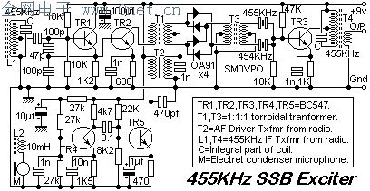 This unit generates an SSB signal at an IF of 455KHz. TR1 forms the carrier oscillator which feeds the mixer and crystal filter. The oscillator coil uses an IF transformer from one of those cheap'n-nasty AM radio's. The filter uses two 455KHz crystals that have a difference frequency of about 1 - 1.5KHz. You will find that the cheaper crystals are never on the same frequency, and they may be "selected" to find a pair with the required difference. To select the crystals temporarily use them instead of L1 in the carrier oscillator circuit and monitor the frequency of oscillation. You can monitor the oscillator on a 160 meter receiver (4th harmonic, 1.820MHz) and look for crystals that give a 4-6 KHz difference in beat-note. Alternatively you could use an SSB crystal filter in the place of the two crystals. The 455KHz oscillator is tuned to one side or the other of the crystal filter passband and is sufficiently stable to maintain this frequency offset. When monitoring transmission set the carrier oscillator so that the carrier cannot be heard or is at a very low level. The capacitor "C" is an integral part of the 455KHz IF transformer used for L1.