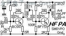 Boosts the final optput up to about 1 watt or so. The 1K2 resistor in the PA base biasing circuit may need adjusting for about 300 mV DC across the 2R2 emitter resistor.