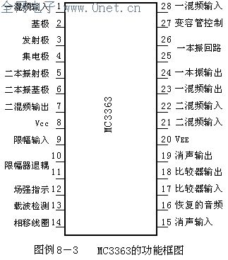 MC3363在MC3362的基础上增加了一只高放管和静噪电路,因此灵敏度更高,性能更好。MC3363的功能框图如图例8-3所示。由于增加了一级高放,所以12dBSINAD灵敏度可达0.3μV。