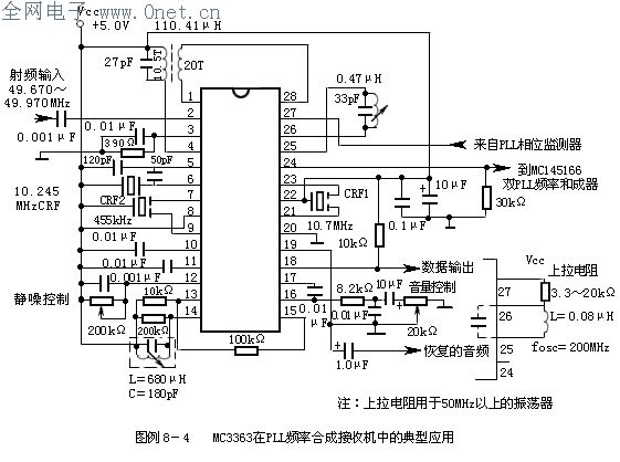图例8-4MC3363在PLL频率合成无绳电话接收机的典型应用例子。MC3363与大规模双PLL电路MC14516617构成310信道的两片式频率合成接收机,MC3363的第一本振作为PLL的VCO。