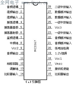 新型的低功耗窄带FM单片接收机电路MC3362,已经包含了除高放外的前端电路,而且还增加了载波检测电路和用于FSK检测的比较器,它适用于窄带话音与数据链路的通信。MC3362的外引线图如图例8-1所示。