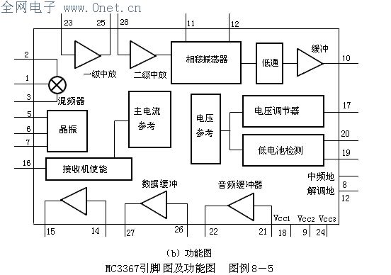 MC3367是低压一次超外差接收机电路,电路简单,由于没有二混频和二本振,故其谐波干扰小,其中频增益要求也特别高。由于MC3367采用了隔离措施,故不易自激。MC3367引脚图及功能图分别示于图例8-5(a),(b)。它包括振荡器,混频器,两级中放,中频限幅电路和相移鉴频器。另外,还有电压调节器,低电池检测电路。低功耗“睡眠模式”电路,两个用于音频与数据接收的缓冲放大器用于FSK数据接收的比较器。其最大特点是灵敏度优异(输入限幅电平为-3.0dB时,其灵敏度为0.2μV),低电压(VCC=1.1~3.0V),低功耗(PD=1.5~50mW),当处于备用状态(睡眠模式)时,消耗电流仅为0.5μA。MC3367输入频带可达75MHz,数据比较器的工作频率大于25kHz(50千波特)。