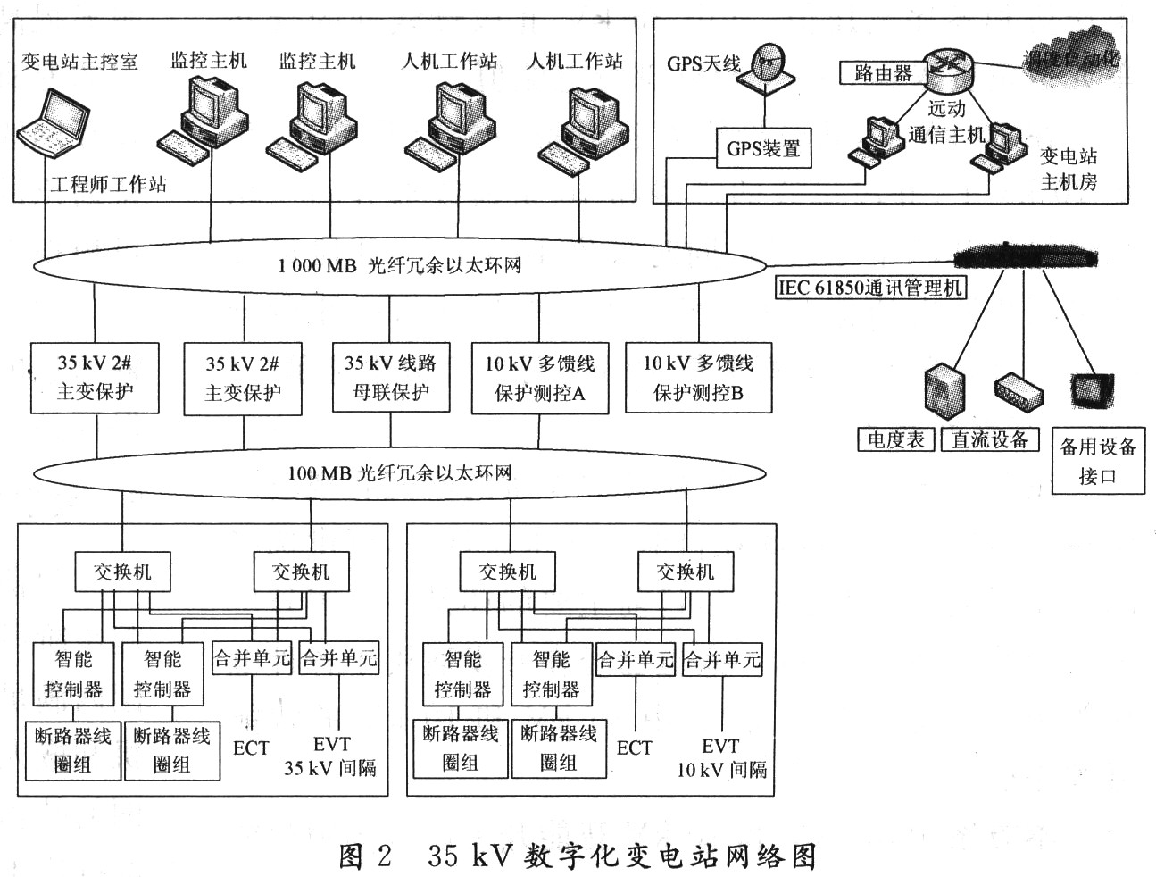 由于间隔层设备之间以及间隔层和变电站层之间需要共享电压、电流值及状态信号,而且间隔层IED数量较多,数据传输量大,为避免出现网络堵塞,保证通信可靠性,变电站层网络采用1 000 MB双光纤交换式以太环网结构,来保证带宽和可靠性。间隔层为支持IEC61850标准的数字式智能电子设备保护、控制、测量,集中组屏安装。分别有#1主变屏,#2主变屏,35 kV两条进线、母联屏,两面10 kV馈线保护屏,每一单元为一独立网络单位,相互之间可以交换信息,基于IEC61850标准规范与环网总线相连,与其他各单元、主站和调度系统进行交换信息。后台控制室通过变电站网络向保护和测控装置下达控制命令,GPS装置也通过变电站网络向全站统一授时,另外,远动系统也由变电站层网络经路由器与外部电力调度网络相连。根据以上对35 kV数字化变电站过程层和变电站层的组网分析,具体网络构建如图2所示。