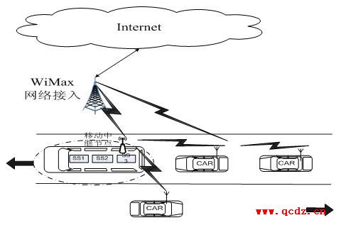 随着WiMAX等宽带无线接入技术的飞速发展,在越来越多的热点地区已经能够实现因特网的宽带无线接入,但是目前还是依赖于有线安装与固定装置,对于移动车辆还是盲点。而DSRC能提供高速的数据传输,并且能保证通信的低延时和低干扰,保证系统的可靠性[7],是蜂窝网络的一种补充。并且很重要的是,DSRC网络是由汽车厂商主导的,因此应将网络设备尽可能的部署在车辆上。WiMAX的无线中继技术[8]为在高频段实现宽带无线接入提供了一种具有高性价比的解决方案,能提供更好的通信质量,同时还能实现对无线资源的二级调度,在改善网络覆盖质量的同时,提升系统容量,提高资源利用率。可以采用移动中继技术实现DSRC与WiMAX的结合。同济大学在DSRC方面的研究起步较早,在国内最早提出了采用移动中继技术融合DSRC,如图3所示,通过移动中继站接入当前服务小区的接入点,并由此接入基础设施网络。携带中继站的车辆能为车内用户提供高速、可靠的公网连接,提供大容量的通信并保证通信质量。车内用户无须直接连接基站,只要通过车载移动中继站就可以进行高速的上传、下载。而车辆间通信是局域联网,是通过DSRC自组织的方式实现,为车间通信提供了高可靠性的连接和数据传输,实现安全性应用,而未装备移动中继的车辆可以通过DSRC网络实现资源共享。