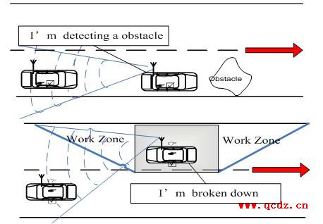 如图2中表示,当前面车辆检测到障碍物或车祸等情况时,它将向后发送碰撞警告信息,提醒后面的车辆潜在的危险[6]。另一情形为,在路边紧急停车的车辆向靠近自己的车发送警告消息,提醒它们不要进入危险区域。车-车通信的应用还包括转弯速度控制、车队管理和安全超车等。