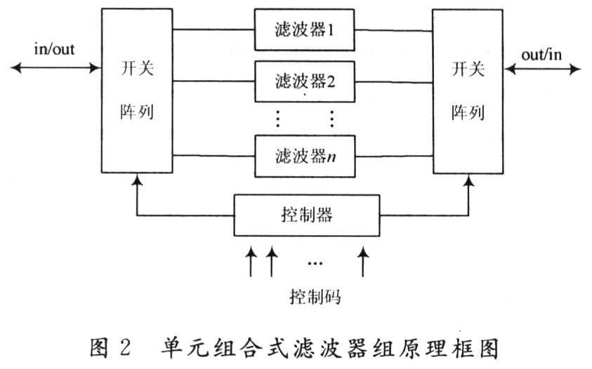 单元组合式滤波器组方案如图2,其电路原理比较容易理解,每一个带通滤波器对应一个中心频率。数字调谐的“控制码”通过“控制器”控制滤波器组输入和输出的“开关阵列”,切换内部不同的滤波器子单元,达到数字调谐选频滤波的目的;也可以手动调节控制器,达到调谐选频滤波器子单元的目的。