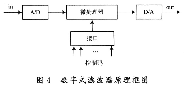 数字式滤波器原理框图如图4所示,其方案基于数字信号处理,把输入模拟信号首先经过A/D转换器变为数字信号,再通过微处理器的FFT(快速傅里叶变换)和IFFT(快速傅里叶逆变换)等变换,进行滤波器函数算法处理数据,最后把处理好的信号通过D/A转换输出。