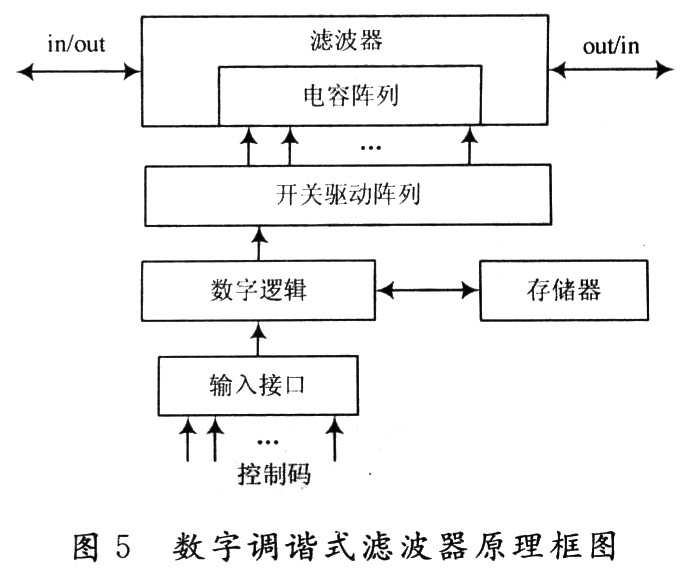 数字调谐滤波器原理框图如图5,控制码通过输入接口电路,控制数字逻辑,数字逻辑中包含移位寄存、程控振动器等逻辑电路,把存储器中存储的数据读入,转变为控制序列,控制开关驱动阵列,驱动滤波器内电容阵列的闭合与断开的组合,进而控制滤波器参数,也就是通过控制滤波器中较少量不同权位的元件组合实现滤波器选频,达到控制滤波器幅频特性的效果。