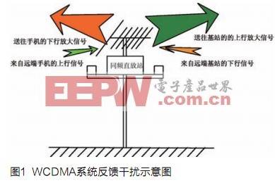直放站在现代通信系统中是必不可少的,但是如果直放站的收发天线隔离度不够,整机增益偏大时,输出信号经延时后反馈到输入端,会使直放站输出信号发生严重失真产生自激。在无线通信系统的同频直放站中,为了减小产品体积以及缩短建站成本,收发天线常常放置在一起(或距离很近)。由于收发天线往往只存在方向角的不同,因此直放站的接收天线肯定会接收到其转发天线所发送的经过放大的信号,而对所期望接收的有用信号产生干扰。如果不对干扰信号进行处理,干扰和期望信号的叠加信号会再次被送进功放,再进行放大转发,干扰信号的强度会一直积累,最终使得直放站无法正常工作。这种正反馈式干扰(干扰信号与正常通信信号的调制参数和载波频率是完全一致的,使得接收机收到叠加有同频干扰的混合信号)还会对数字通信产生严重的电磁干扰,从而阻碍正常的通信。在上、下行链路中,往往都存在着这种反馈式干扰,如图1所示。