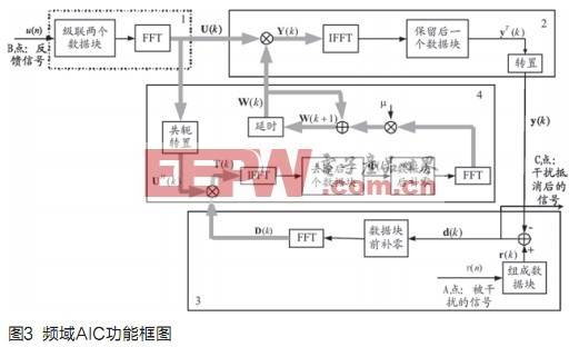 频域自适应干扰抵消(AIC)模块利用了频域实现的LMS算法[2,3]。该算法通过1/2重叠保留法的快速傅立叶变换(FFT),在频域以直接相乘的计算方式实现快速相关和快速卷积[4]。算法基本框图如图3,其中A点为被干扰的信号,B为反馈链路的信号,C点为干扰被抵消后的输出。主要包括以下循环执行的操作流程,其中k表示第个k数据块: