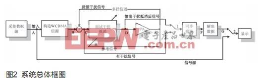 (1)在没有干扰的情况下,所采集的数据源从A点输入,然后将其构造为WCDMA信源,作为频域干扰抵消模块的输入。为了使干扰抵消模块正确运转,在本设计中的B点输出信号为每个码片4采样。