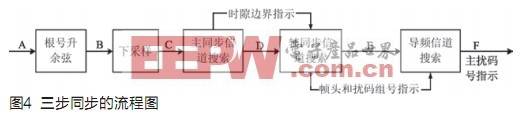 对于任何一个系统,要进行正常的运作都必须首先保证系统的同步。WCDMA的小区搜索分为三个阶段,即主同步、辅同步和导频搜索三个阶段[5]。主同步利用PSC码对接收到的主同步信道数据(PSCH)做相关,根据相关峰值的位置确定时隙头。在主同步完成之后,辅同步阶段可以确定帧头位置和当前小区使用的扰码组号。方法是用辅同步码(SSC)去做相关。最后一个阶段是导频搜索,利用已经得到的扰码组号和帧头信息,遍历一个主扰码组所有的8个可能主扰码,分别和导频信道(CPICH)做相关。根据最大的相关值最终确定扰码号。可见,经过WCDMA的三步同步,就可以得到当前小区的主扰码号和帧同步信息。三步同步的流程图如图4所示。