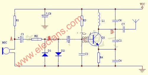 C8是电源旁路电容。R1是MIC的偏置提供话筒的静态工作点。R1现MIC构成了拾音回路。C1、C2起声音信号的耦合作用。R2、D1、D2组成限幅电路,防止话筒在近距离时输入信号过大而失真严重。R3、R4用于提供Q1的静态工作点。C3、C4、C5、C6、L1、Q1构成振荡、放大。C7将信号耦合到天线。天线则将已经过调制的声音信号发射出,本电路由3V供电,用两只1.5V的电池即可。 | |||||||||||||||||||||||||||||||||||||||||||||||||||||||||||||||||||||||||||||||||||||||||||||||
