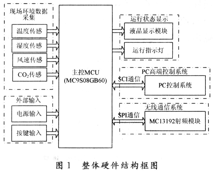(1)主控MCU的选取。从芯片内部集成功能模块、RAM和FLASH的存储容量、芯片和开发环境的熟悉程度等方面考虑,本文选择了Freescale公司生产的S08系列的8位MC9S08GB60(以下简称GB60)作为平台的主控芯片。HCS08核,最高总线频率可达40 MHz;它内部具有64 KB的FLASH和4 KB的RAM存储空间;内部集成了1个SPI模块,适合与MC13192的通信;2个SCI模块,方便与PC通信;具有背景调试模块.能利用单线对HCS08核的系列MCU进行方便地写入和调试,加快开发的速度并大大降低了调试的难度。