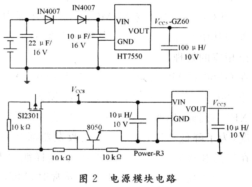 在电源电路中,主控芯片电源在任何情况下都是存在的.这样保证任何情况下GB60都是工作的;外围模块电源受到主控芯片控制,GB60通过MOS管来控制外围模块电源:当系统正常工作时,GB60允许外围模块电源上电;当系统进入低功耗状态时,GB60切断外围模块电源.这样整个系统只有主控芯片有供电,主控芯片再进入低功耗模式(Stop Mode),这样就更好地实现了整个系统的低功耗。注意,在切断外围模块电源时,不能直接使用一般的三极管,这样进入低功耗状态后外围模块仍然有较大的电流消耗,应该使用电流截止性能好的MOS管(如:SI2301)来实现。