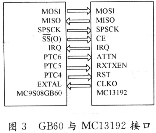 MC13192的IRQ管脚连接到GB60的IRQ管脚上,MC13192上产生的所有中断事件直接反映给GB60。当GB60接收到来自MC13192的外部中断时,还要查询其中断标志寄存器,来判断产生的中断事件,并作出相应的处理。