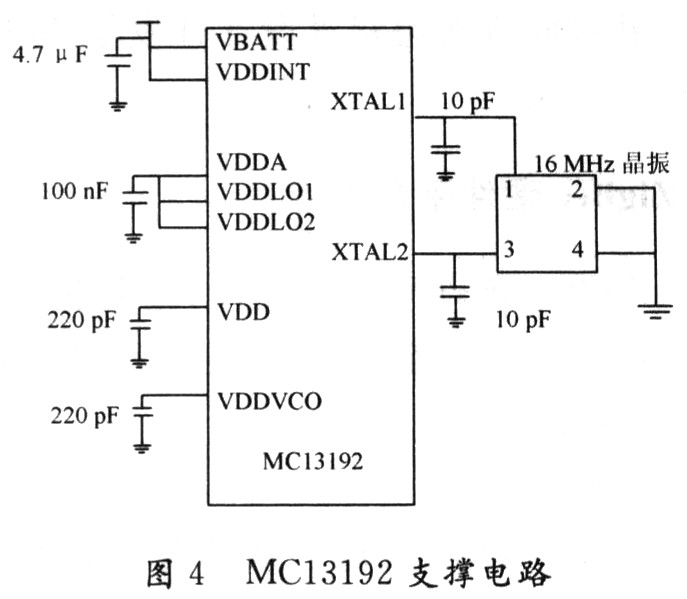 (1)MC13192支撑电路的设计。MC13192的支撑电路包括电源电路,滤波电路和晶振电路,其逻辑连接如图4所示。VBATT和VDDINT是电源输入引脚,MC13192的正常工作电压为2.0~3.6 V,必须接一个4.7μF的稳压电容。VDDA,VDDL01和VDDL02为经过整流的模拟电压,必须旁接一个100 nF的滤波电容。VDD为经过内部整流的数字电压,旁接一个220 pF的滤波电容。VDDVCO为VCO电路供电,同样必须旁接一个220 pF的电容。XTAL1和XTAL2外接16 MHz的专用于2.4 GHz射频电路的晶振,其旁路电容为1O pF。