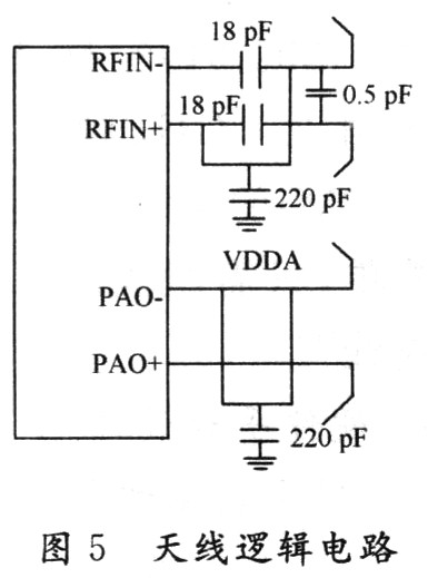 图5为天线电路的原理图。RFIN-和RFIN+为接收通道,2个18 pF的电容过滤掉高频干扰信号,而0.5 pF的电容能防止共扼干扰。PAO-和PAO+为发送通道,这两个管脚和VDDA连在一起,给发送通道提供必要的能量。
