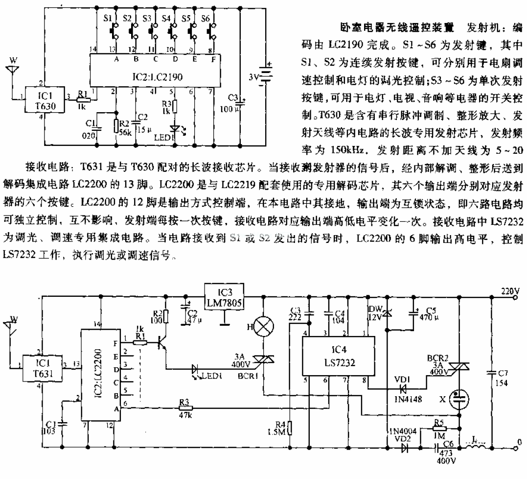 发射机:编码由LC2190完成。S1-S6为发射键。