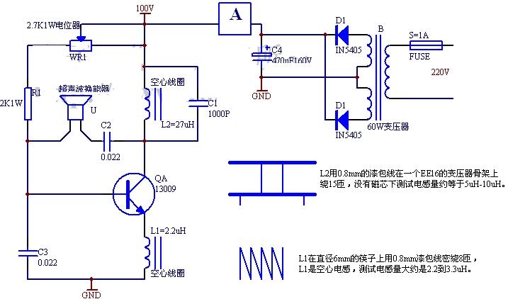 见下电路图:由QA、L2、C1、L1、C3、C2、R1及U和WR1组成一个大功率的高频振荡器,采用电容三点式振荡电路,电路的振荡频率是超声波压电换能振子U的固有频率1.013MHz。L2和C1组成的谐振回路在这里不决定振荡器频率,而是决定振荡幅度,它的谐振频率比电路的振荡频率约低,L1和C3谐振频率大于电路的振荡频率,采用两个谐振回路是为了使电路的振荡频率合成,使振荡器在大功率下保证稳定工作。