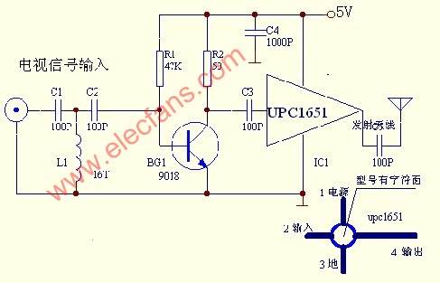◆小功率宽频带电视发射电路的工作原理是射频信号经75欧姆射频电缆送至有C1、 L1、C2 构成的高通滤波器,将低于45MHZ的频率滤除,然后在经三极管9018等组成的前置放大 器放大后由电容C3送至upc1651进行功率放大,其输出信号经60cm左右的鞭状天线发射 出去。7805等构成稳压与电源指示为upc1615提供5V的供电。