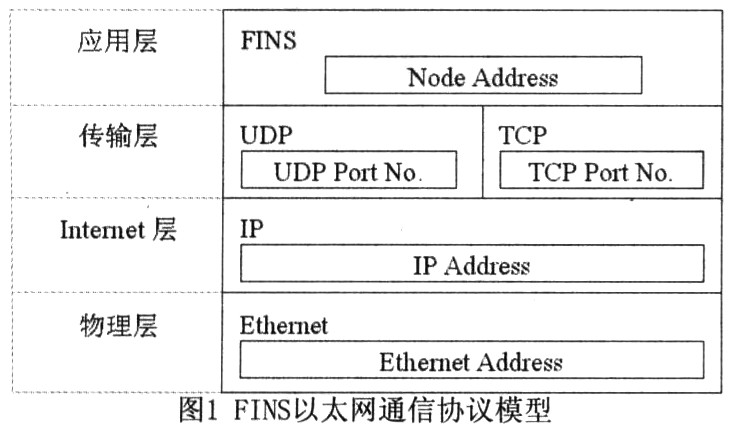 在以太网FINS通信中,各种数据信息是以UDP/IP包或者TCP/IP包的方式在以太网上发送和接收的。其中,在Internet层远程设备使用的是IP地址,而在应用层使用的则是FINS节点地址。传输层中定义了本地UDP或TCP端口号,它为应用层(即FINS通信)提供通信端口,其默认设置为9600。用户可以根据实际情况自行修改,但是在同一网络中,各设备的通信端口号必须保持一致。图1 FINS以太网通信协议模型
