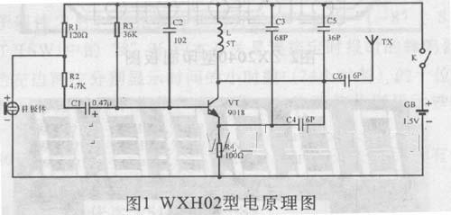 图1是wxh02型无线话筒的电路原理图。该电路主要由驻极体话筒和一只高频三极管90l 8组成。三极管vt外围元件l、c4、c5等外围元件组成高频振荡电路。驻极体话筒BM将声音信号变成电信号,通过电解电容C1耦合到vt的基极,对高频等幅振荡电压进行调制,经过调制的高频信号通过c6,由天线向外发射。R3、R4是VT的直流偏置电阻,r4组成直流负反馈电路,使得vt的工作更加稳定。l和c5决定振荡频率,f=1/2π,调整l的匝数及间距可改变振荡频率。R1为驻极体话筒的供电电阻。