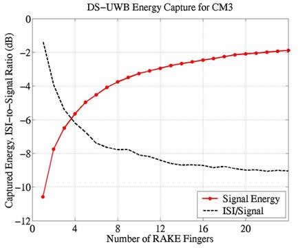 图三将DS-UWB系统的多路径能量损耗以及 讯号/符码间干扰 的比值 (signal-to-ISI ratio) 表示成RAKE finger总数的函数,图中所示为通道中第90个百分位的数值,这相当于4至10公尺非可视范围的通道环境 (CM3),以及114 Mbps的数据速率。图中还假设所选择的RAKE finger可在大约40 μs的间距内获得最大的多路径系数。从图三可看出,就算使用理想的16 finger RAKE,DS-UWB系统仍只能收集56%的多路径能量;使用16 finger耙式接收器时,符码间干扰只比讯号能量小9 dB,这会造成系统效能下降。值得注意的是,当数据速率加倍时,处理增益会减少一半,使得符码间干扰增加3 dB,例如对于16 finger耙式接收器来说,200 Mbps数据速率的符码间干扰约比讯号能量小5 dB,因此若没有均衡器的协助,讯号杂波比 (SINR) 将不足以使得信息位被成功的译码。