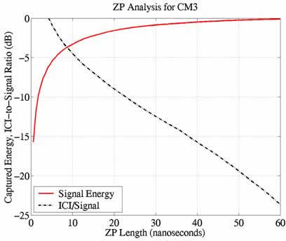 补零前缀的长度决定其所能收集的多路径能量,补零前缀区间 (ZP window) 以外的多路径能量则会造成载波间干扰 (Inter-Carrier-Interference,简称ICI),所以选择补零前缀长度时,应将载波间干扰的影响减至最小,将收集的多路径能量增至最大,同时减少循环前缀带来的额外处理负担。(图四:补零前缀的长度如何影响接收器在4至10公尺、非可视范围通道环境内所收集的能量,以及补零前缀区间外多路径能量所造成的载波间干扰)。以MB-OFDM解决方案中使用60.6 ns的补零前缀长度做比较,它在此通道环境内所实现的第90个百分位通道约能收集95%的多路径信道能量。