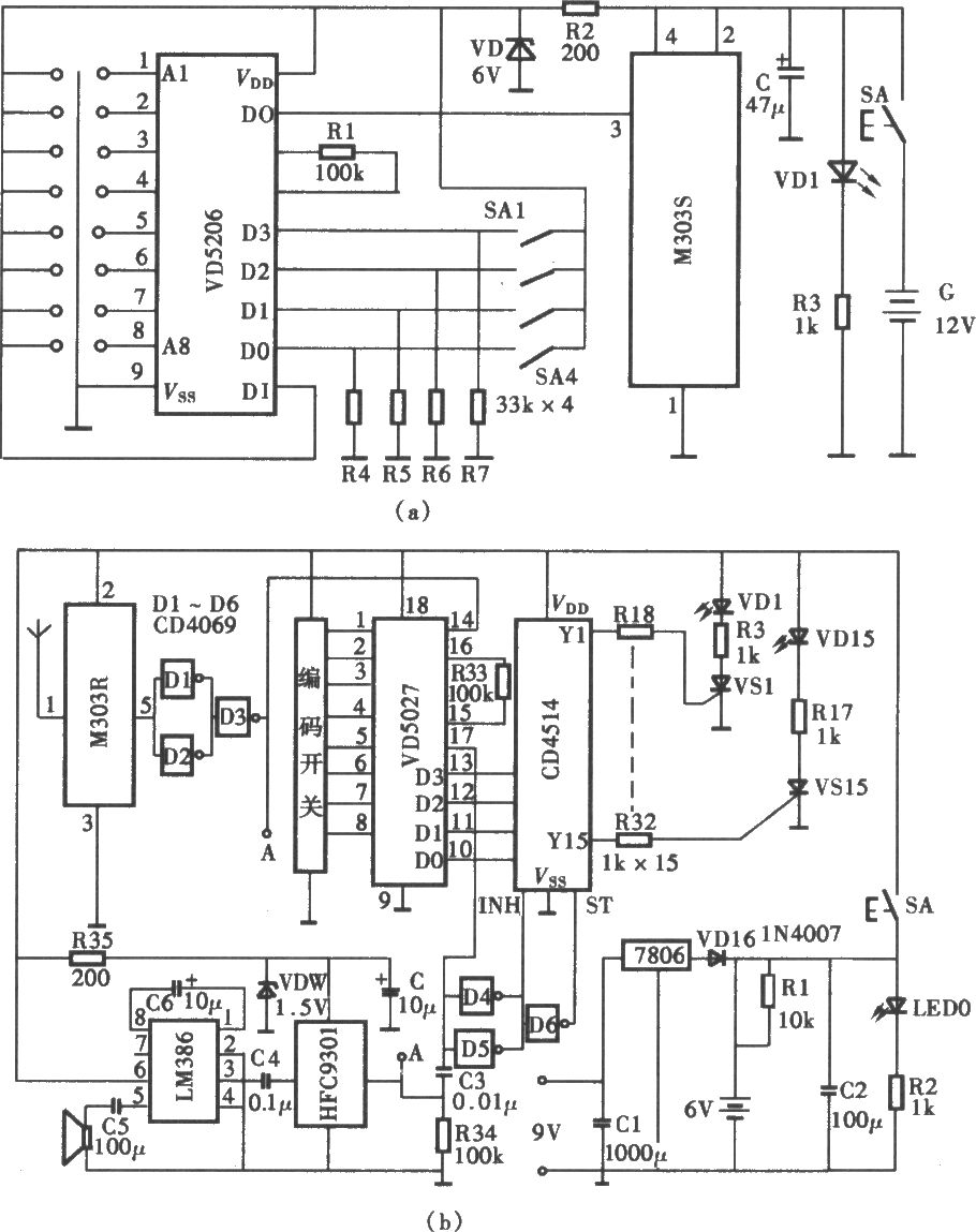 病房无线呼叫系统电路 (a)发射器电路;(b)接收显示器电路