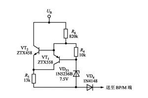 TinySwitch-Ⅲ系列产品能够正常启动和工作的最低漏极电压为50V。通常情况下,当交流输入电压u>85V时,芯片可提供自供偏压。但是当18V<u<75V时,芯片就无法提供足够的偏压以维持正常工作,这就大大限制了TinySwitch-Ⅲ系列产品在低压情况下的应用。为解决上述难题,使TinySwitch-Ⅲ在超低交流输入电压下也能正常工作,需要从TNY280P外部增加一个悬浮式高压电流源,以便在低压时给旁路端BP/M继续供电。悬浮式电流源的电路如图3所示。它包括7.5V稳压管VDZ1(1N5236B)、PNP型晶体管VT1(ZTX558)、NPN型晶体管VT2(ZTX458)、二极管VD2和VD4、电阻R4~R6。其中,VD2为半波整流管;VD4为隔离二极管,可将电流源与其他电路隔离开。